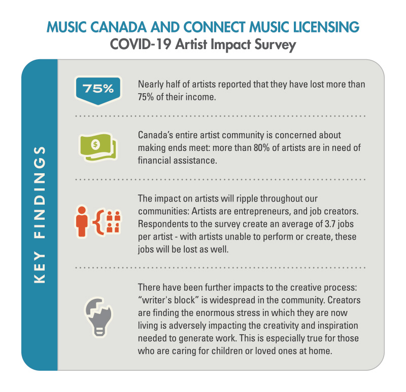 The COVID-19 crisis has created an unprecedented challenge for the music community, and has shed light on the sad realities faced by artists everyday. As Chair of Music Canada’s Advisory Council, I partnered with Music Canada and CONNECT Music Licensing to conduct an Artist Impact Survey. Developed in consultation with artist members of the Advisory Council and with Deloitte, the survey received responses from artists from across the country and across all stages of their careers. The preliminary results are in and they make crystal clear the serious and possibly irreparable harm the pandemic has had on Canada’s artists. The majority were already living in a precarious state – and this pandemic has only exacerbated their challenges.