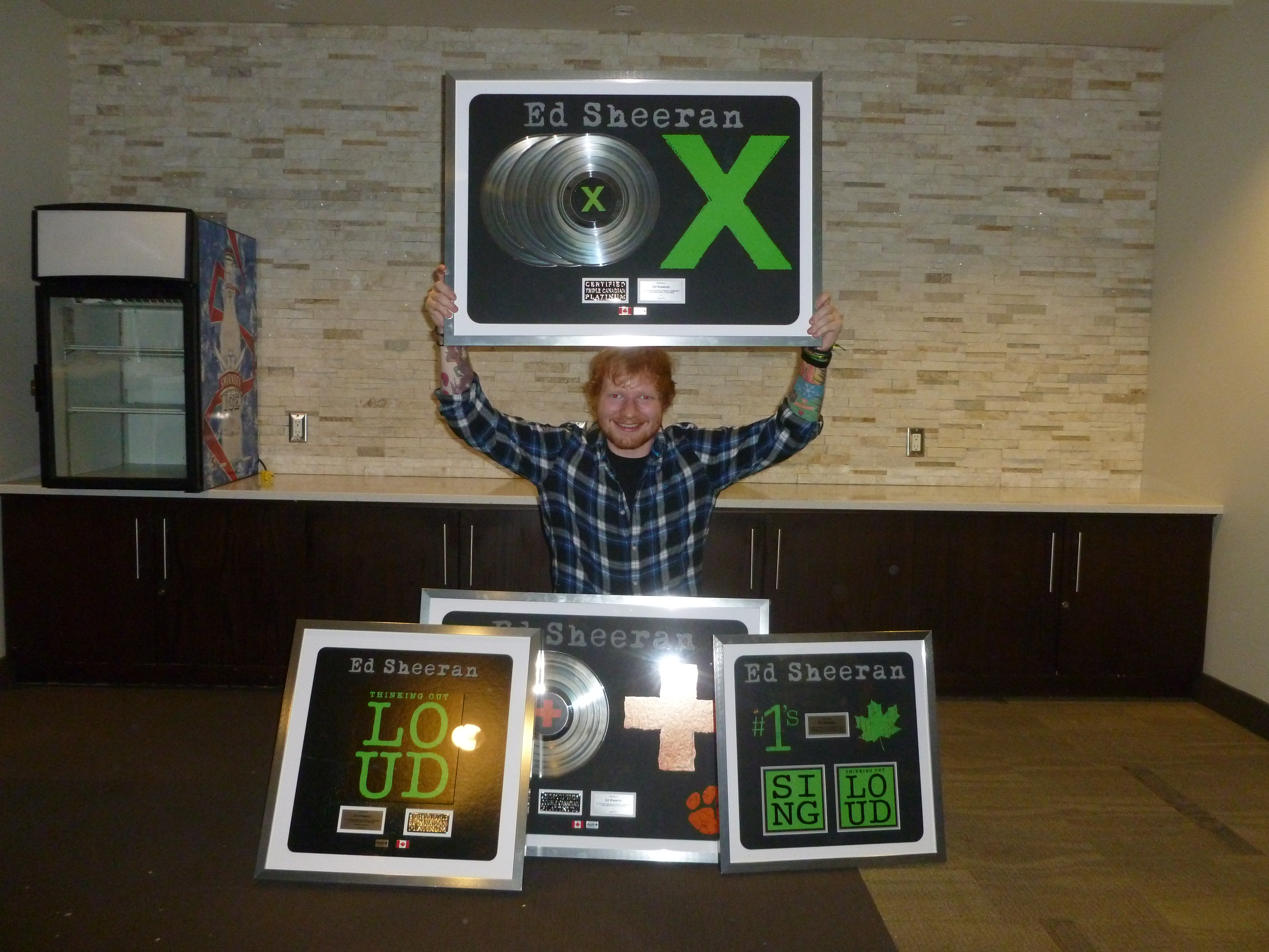 English singer/songwriter Ed Sheeran, who’s currently touring through the country on the Canadian leg of his 2015/16 world tour, was presented with several plaques in Toronto this weekend by Warner Music Canada prior to his June 6th sold-out show at the Air Canada Centre. Sheeran received a Double Platinum plaque for his 2011 album + and a 5X Platinum digital download plaque for his track “Thinking Out Loud” from the Triple Platinum 2014 album X, which Sheeran was also presented a custom plaque for. The fourth plaque (pictured far right) commemorates his #1 singles at Canadian radio for “Sing” & “Thinking Out Loud”.