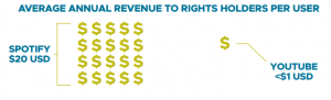 This trend is concerning, as user-upload services like YouTube pay significantly lower royalty rates compared with other music streaming services.  This has a significant impact on artists’ and other rights holders’ incomes: plays on Spotify or Apple Music put dramatically more money in their pockets than the same number of plays on YouTube. The average annual revenue to rights holders per user is estimated by IFPI at under US$1 on YouTube, while on Spotify the comparative figure is US$20.