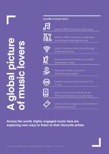 The report presents a profile of music lovers, who listen to more music per week, and to listen on a greater variety of services and platforms.