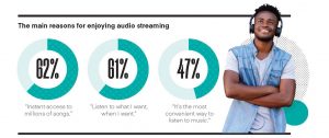 Overall, 89% of respondents listen to music using an on-demand streaming service. The biggest reasons consumers enjoy these services include access to large catalogues of music, and the convenience of listening.