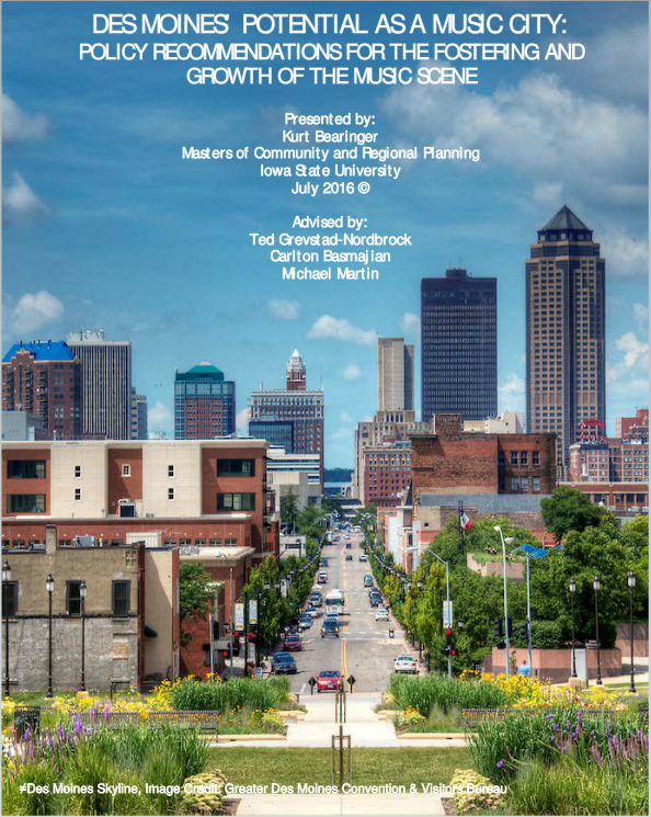 “It is my hope that this report will spark positive changes to the Des Moines music scene and be used as a tool convincing the City and Council to prioritize live music, partner with the music community, and create a city identity around live music,” says Bearinger, author of the report. “If followed, the sixteen policy recommendations could set the foundation needed to transform Des Moines into a nationally recognized music city.”
