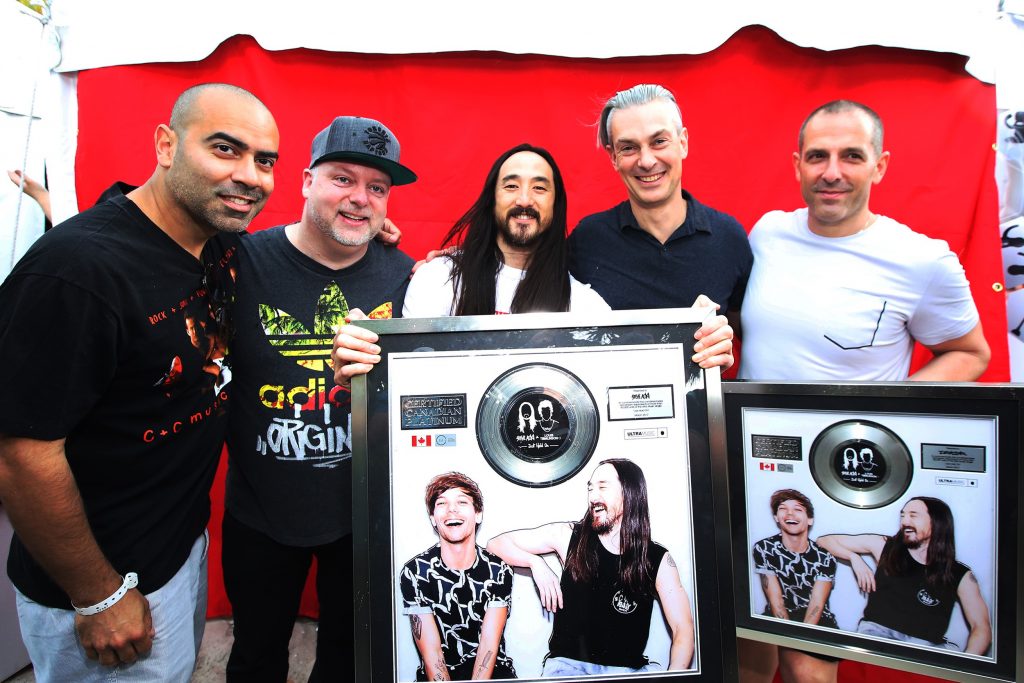 While in Miami for a headlining DJ set at the Ultra Music Festival, Steve Aoki was surprised with a Platinum Single Award plaque for the track “Just Hold On.” The hit also features One Direction member Louis Tomlinson, marking the first time Tomlinson has received a Canadian certification as a solo artist.