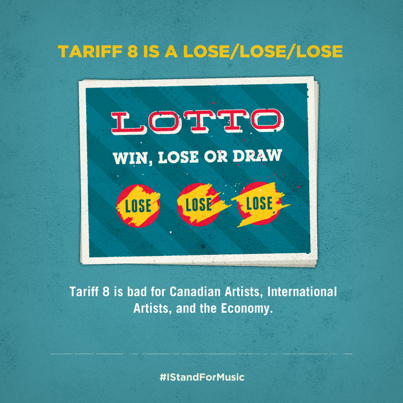 Tariff 8 is a lose / lose / lose: it’s bad for Canadian artists, int’l artists, & the economy: http://t.co/NfoSied5ae pic.twitter.com/k2m4NbluPA