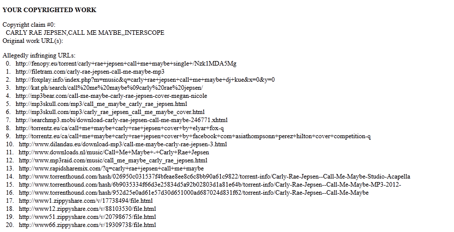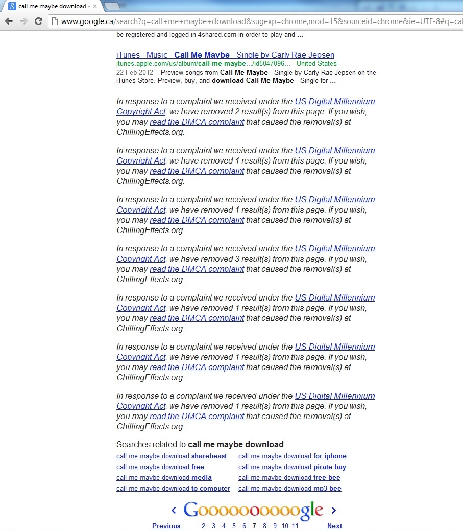 So I took a moment to see how Canada’s Carly Rae Jepsen is faring a few weeks on. Where are the legal sites; is it easy to find legal sources for music? Well, you can see the mountains of DMCA take-down notices that have accumulated. By the second page, about half the returns are takedown notices. Is this Google’s way of helping?