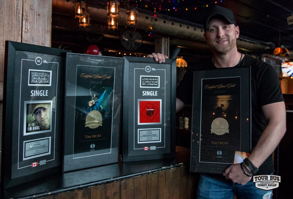 Canadian country star Tim Hicks was presented with two Platinum Single Award plaques Monday at a surprise event at Toronto bar Grace O’Malley’s, where Hicks began his music career performing covers before signing with Open Road Recordings. Hicks was presented with plaques for his 2013 hits “Get By” and the breakthrough viral hit “Stronger Beer,” which was never officially released as a single.