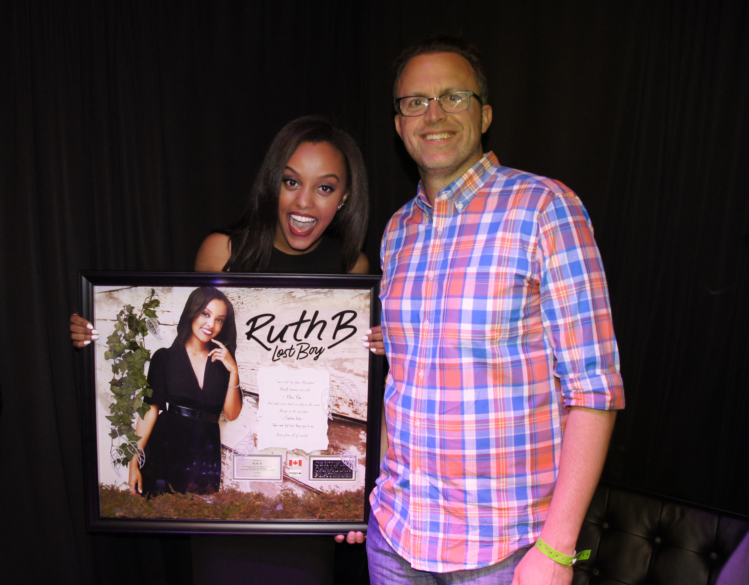 Edmonton, AB singer/songwriter Ruth B, seen below with manager Mark Cunningham, received her first Platinum award plaque from Sony Music Canada for her breakthrough hit “Lost Boy.” The 2016 Fan Fave Vine Musician nominee performed the song during the pre-show broadcast.