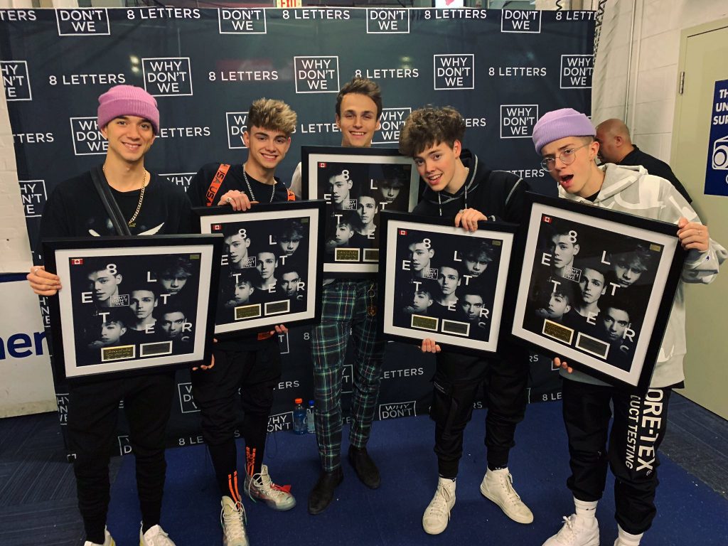 Earlier this week, American pop group Why Don’t We played their biggest Canadian shows to date, stopping at Laval, QC’s Place Bell and Toronto, ON’s Coca-Cola Coliseum as part of their 2019 North American tour. Ahead of Tuesday’s sold-out show in Toronto, Warner Music Canada surprised WDW with their first ever award plaques for any territory, commemorating the Canadian Gold certification of the their single “8 Letters,” the title track of their 2018 debut album.